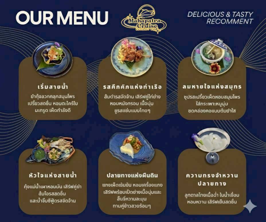 Invite you to have new experience cruising, Mahapatra Cruise at night on the beautiful Chao Phraya River. Immerse yourself in the romantic atmosphere, taste the eclectic style of Thai food, listen to the beautiful dulcimer music, that will make your special night and those you love, touching, touching, and unforgettable.