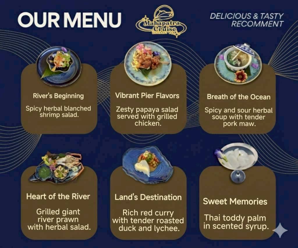 อัตรานี้รวม 1. เครื่องดื่มต้อนรับ 2. เซ็ทเมนูอาหารไทย-นานาชาติ 3. การแสดงสดดนตรีไทย (บรรเลงขิม) 4. ล่องเรือ 2 ชม.