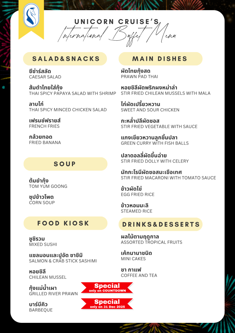 เรือยูนิคอร์น ครูซ โปรแกรมปีใหม่ รอบ Dinner ท่าเรือ: เทอร์มินอล 21 พระราม 3 *บุฟเฟต์นานาชาติ-ซีฟู๊ด+บาร์บีคิว* Code: #เรือยูนิคอร์น ครูซ วันปีใหม่ รอบดินเนอร์ ราคาพิเศษ ผู้ใหญ่ 1,200 บาท เด็ก 4-10 ปี 1,000 บาท ช่วงเวลาเดินทาง: วันพุธที่ 31 ธ.ค.68 เวลา 19.15-21.15 น. PDF รายละเอียด 2023-10-28