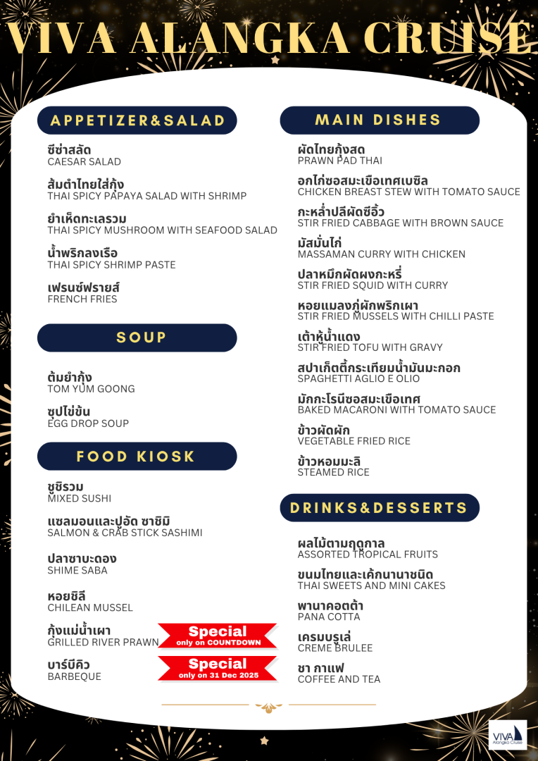เรือวีว่าอลังกาครูซ โปรแกรมปีใหม่ รอบ Countdown @ท่าเรือเอเชียทีค เจริญกรุง *BBQ+กุ้งแม่น้ำเผา+แชมเปญ+ไวน์+เบียร์+น้ำอัดลม+จับฉลากปีใหม่* Code: #เรือวีว่า อลังกา ครูซ โปรแกรมปีใหม่ รอบ Countdown ราคาเริ่มต้น ผู้ใหญ่ 4,500 บาท เด็ก 4-10 ปี 3,500 บาท ช่วงเวลาเดินทาง: วันพุธที่ 31 ธ.ค.68 เวลา 21.15-00.15 น. PDF รายละเอียด 2023-10-27