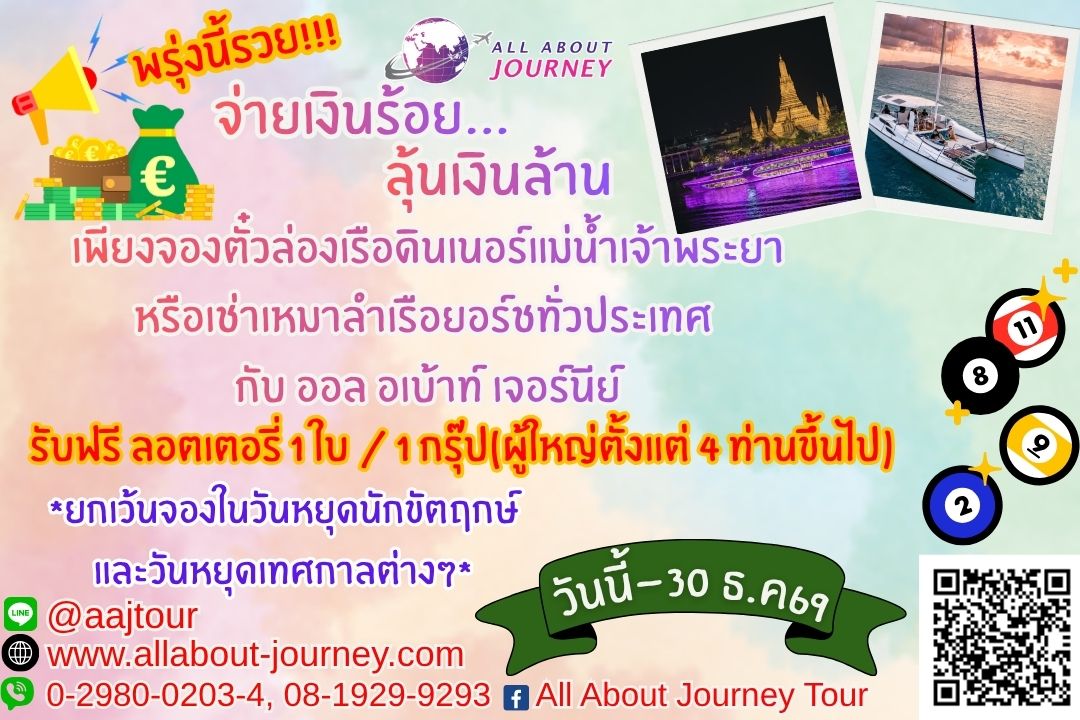 กิจกรรมร่วมสนุก AllAboutJourney พรุ่งนี้รวยยยยยยย จ่ายหลักร้อย คุณอาจได้เป็นเจ้าของเงิน 6 ล้าน #ล่องเรือลุ้นล้านกับAllAboutJourney ที่เดียวเท่านั้นเพียงจองตั๋วล่องเรือดินเนอร์แม่น้ำเจ้าพระยากับเรา รับฟรี สลากกินแบ่งรัฐบาล จำนวน 1 ใบ/1 กรุ๊ป (ผู้ใหญ่ตั้งแต่ 4 ท่านขึ้นไป) ยกเว้น การเหมาชั้นและเหมาลำสำหรับเรือยอร์ชทั่วประเทศ เพียงเช่าเหมาลำกับเรา ทุกกรุ๊ป รับฟรี สลากกินแบ่งรัฐบาล จำนวน 1 ใบ/1 กรุ๊ป(ผู้ใหญ่ตั้งแต่ 4 ท่านขึ้นไป) ไม่ต้องลุ้นเลข ไม่ต้องเหนื่อยเดินหา เราจะนำโชคมาให้ท่านสำหรับลูกค้าที่ชำระภายในวันที่ 1 มกราคม – 30 ธันวาคม 2569 เท่านั้นดูรายละเอียดเรือดินเนอร์ คลิก https://bit.ly/2HcwaI0ดูรายละเอียดเรือยอร์ช คลิก https://bit.ly/3j0DraY เงื่อนไขไม่สามารถเจาะจงหมายเลขสลากฯ ได้โปรโมชั่นนี้ ไม่สามารถใช้ได้ในวันหยุดเทศกาล วันหยุดนักขัตฤกษ์ต่างๆสลากฯ จะจัดส่งให้ทางไปรษณีย์แบบลงทะเบียน หลังจากลูกค้าใช้บริการเรียบร้อยแล้วเท่านั้นกรณีใช้บริการวันที่ 21-06 ของเดือน สลากฯ จะเป็นงวดประจำวันที่ 16กรณีใช้บริการวันที่ 07-20 ของเดือน สลากฯ จะเป็นงวดประจำวันที่ 01หากสลากฯ สูญหายหรือเสียหายหลังการจัดส่ง บริษัทฯไม่รับผิดชอบทุกกรณีหากลูกค้ายกเลิกการจอง ก่อนใช้บริการ บริษัทฯ ขอสงวนสิทธิ์ไม่แจกสลากฯ ทุกกรณีหากลูกค้าไม่แจ้งที่อยู่ในการจัดส่งสลากฯ ภายใน 3 วันนับตั้งแต่วันที่ได้รับแจ้ง ถือว่าลูกค้าสละสิทธิไม่รับสลากฯ หากบริษัทฯ ไม่สามารถจัดหาสลากฯ ได้ตามกำหนดเนื่องจากเหตุสุดวิสัยต่างๆ เช่น คำสั่งจากภาครัฐ จำนวนสลากฯ ที่มีจำหน่ายไม่เพียงพอ ฯลฯ บริษัทฯ จะจัดส่งสลากฯ ในงวดถัดไปให้แทน