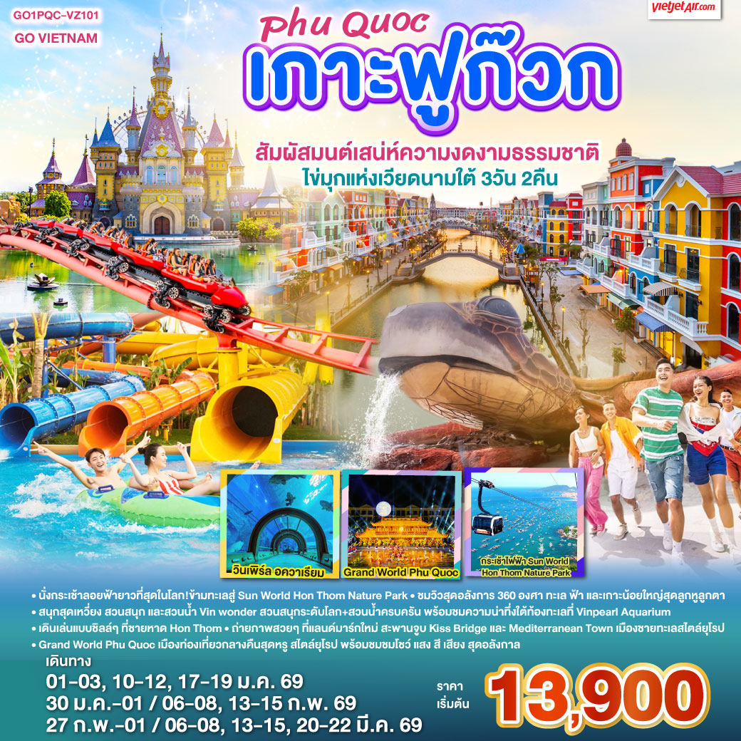 - วันที่ 2 เกาะฟูกว๊ก • สวนสนุก และสวนน้ำ Vin wonder • วินเพิร์ล อควาเรียม • Grand World Phu Quoc • บ้านไม้ไผ่ • อิสระชมโชว์ แสง สี เสียง ที่ Grand World หรือ อิสระ Corona Casino
