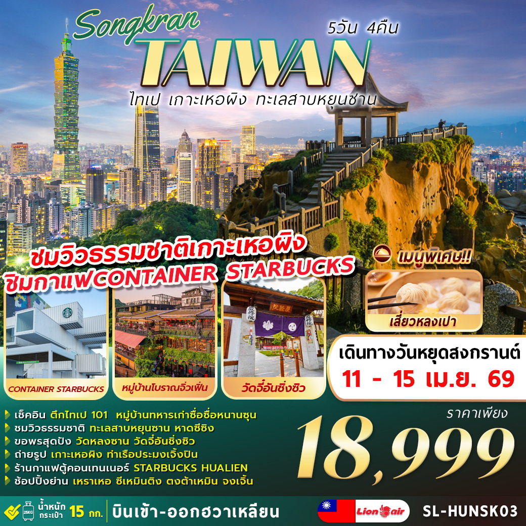 *สงกรานต์* *บินตรง* ทัวร์ไต้หวัน (Taiwan): ไทเป เกาะเหอเผิง ทะเลสาบหยุนซาน 5 วัน 4 คืน บินกับ THAI LION AIR (SL)