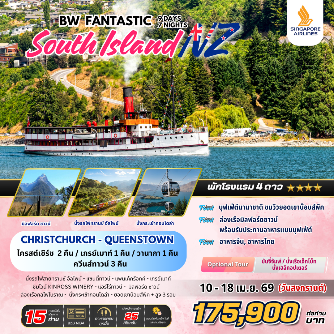 - วันที่ 6 (พ. 15 เม.ย. 69) ควีนส์ทาวน์ – มิลฟอร์ด ชาวน์ – ควีนส์ทาวน์