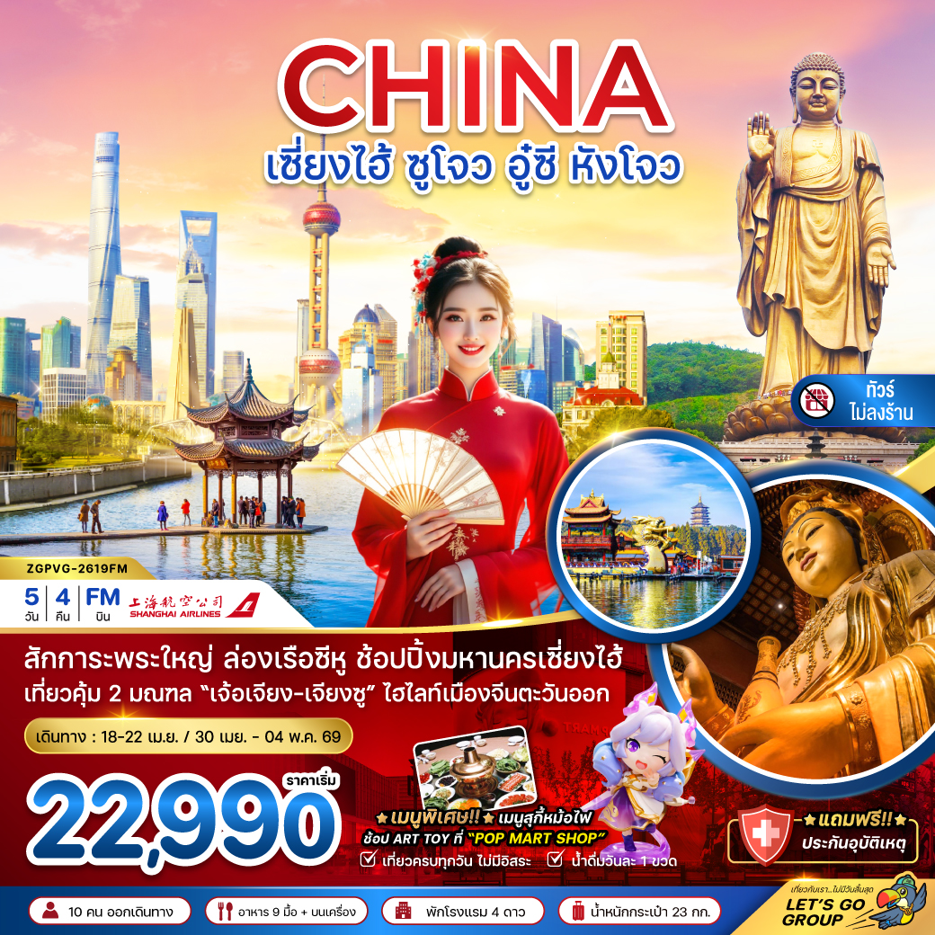 - วันที่ 2 เมืองซูโจว – วัดฉงหยวน – สักการะพระเจ้าแม่กวนอิม – ถนนโบราณชีหลี่ซานถาง – Yuanrong Time Square – ถนนปิงเจียง
