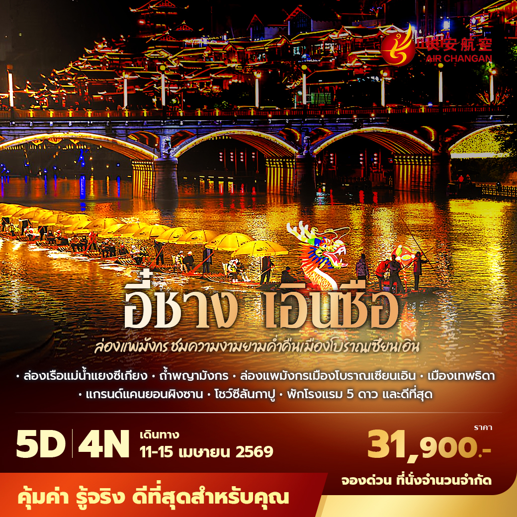 - วันที่ 2 เขื่อนซานเสีย – ล่องเรือซานเสีย – จุดชมวิวแม่น้ำแยงซีเกียง – บ้านเกิดชวีหยวน – นั่งรถไฟ ความเร็วสูง D5951:15.19 – 03 – สู่เมืองเอินซือ – โชว์ซีลันกาปู