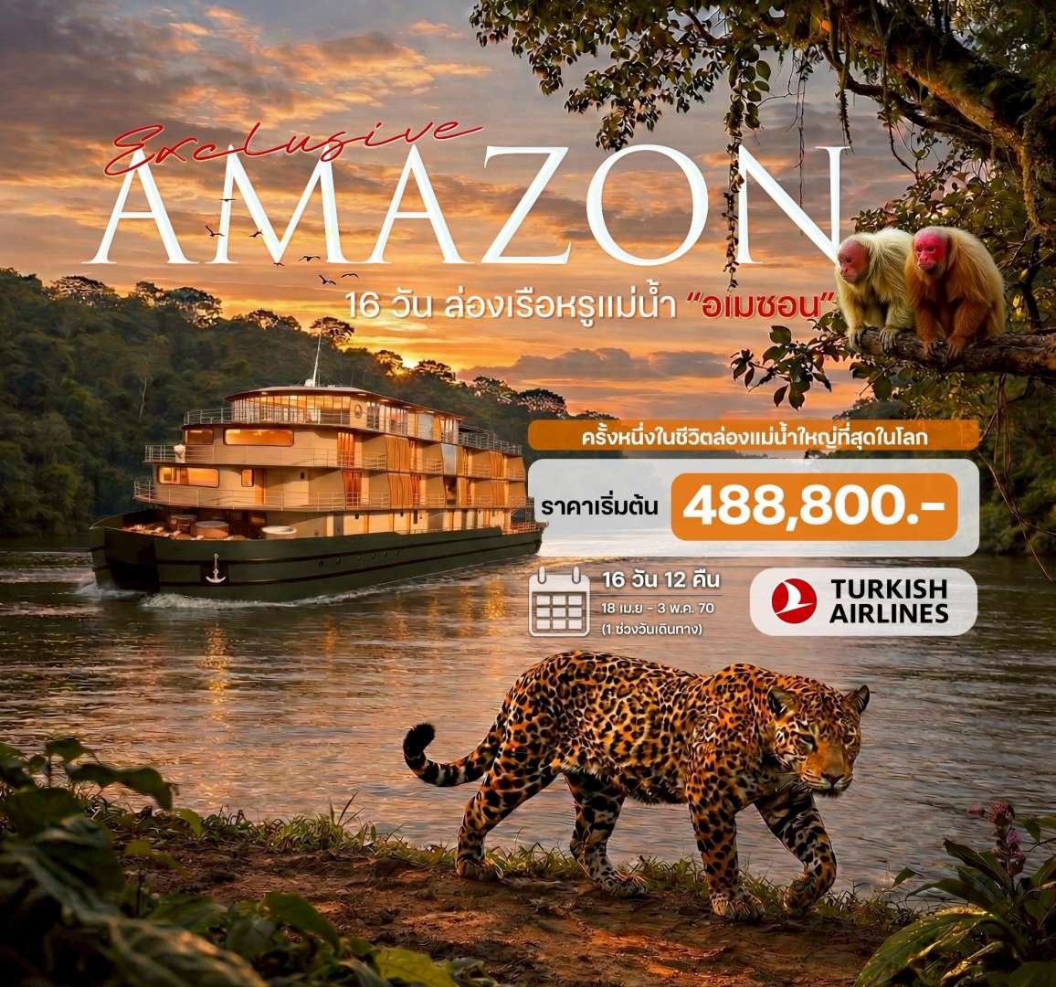ทัวร์ อเมริกาใต้ (South America): ล่องเรือหรูแม่น้ำอเมซอน 16 วัน 12 คืน บินกับ Turkish Airlines (TK)