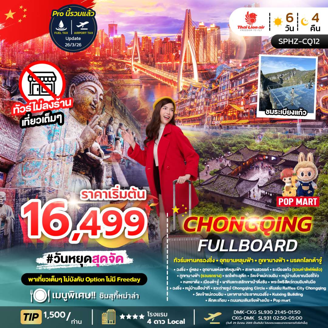 - วันที่ 3 ภูเขานางฟ้า (รวมรถราง) – ฉงชิ่ง – รถไฟทะลุตึก – หมู่บ้านโบราณฉือชี่โข่ว- หงหยาต้ง