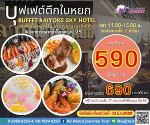 บุฟเฟต์ตึกใบหยก (BUFFET AT THE BAIYOKE SKY HOTEL) ห้องอาหารตลาดน้ำใบหยก-มื้อกลางวัน ชั้น 75 Code: #บุฟเฟต์ตึกใบหยก-มื้อกลางวัน ราคาเริ่มต้น ผู้ใหญ่ 590 บาท เด็กส่วนสูง 80-120 ซม. 295 บาท ช่วงเวลาเดินทาง: เปิดบริการทุกวัน 11.00-15.00น. PDF รายละเอียด 2026-01-24