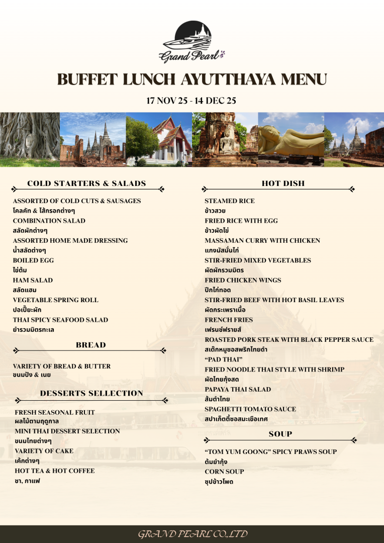 ขอต้อนรับสู่เรือ “ Grand Pearl ” เรือที่หรูหราและสะดวกสบายที่สุดที่จะนำท่านล่องแม่น้ำเจ้าพระยา กลับสู่กรุงเทพมหานคร พร้อม รับประทานอาหารกลางวันแบบบุฟเฟ่ต์ไทย และยุโรป ดื่มด่ำกับบรรยากาศแบบไทยๆ ชมทิวทัศน์ที่สวยงามและชีวิตความเป็นอยู่ของชุมชนริมสองฟากฝั่งลำน้ำเจ้าพระยา |
