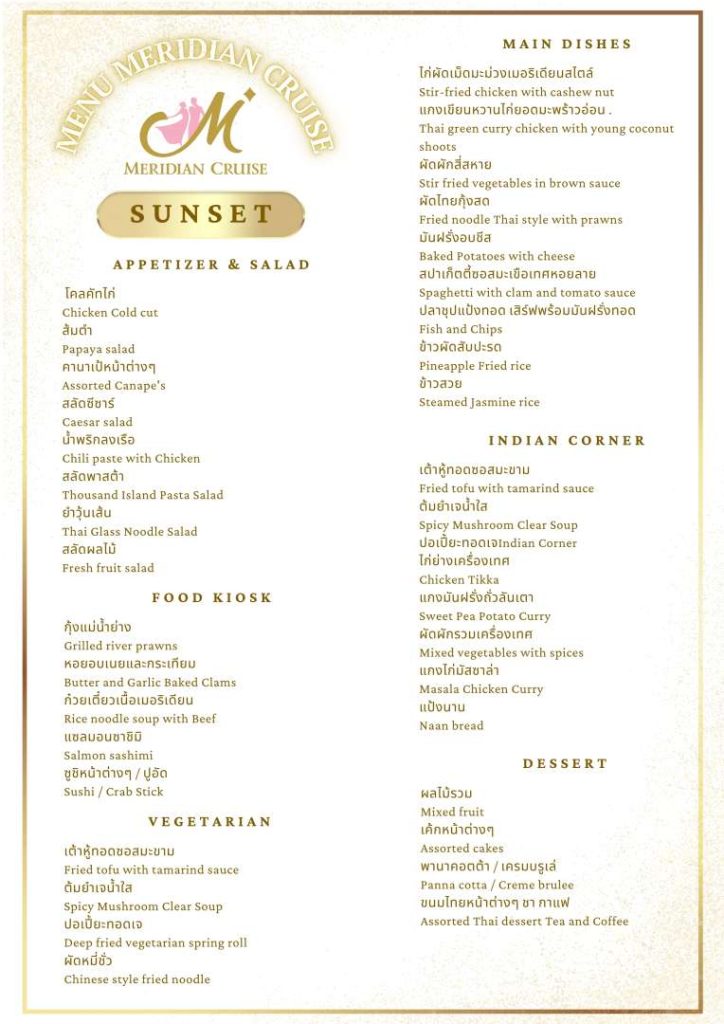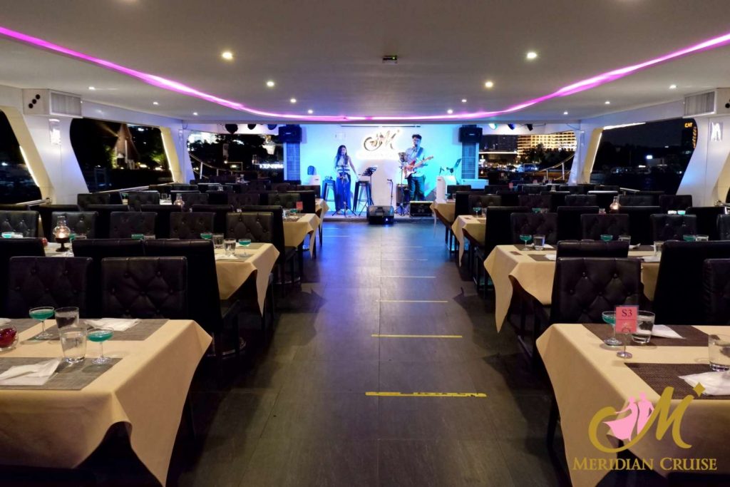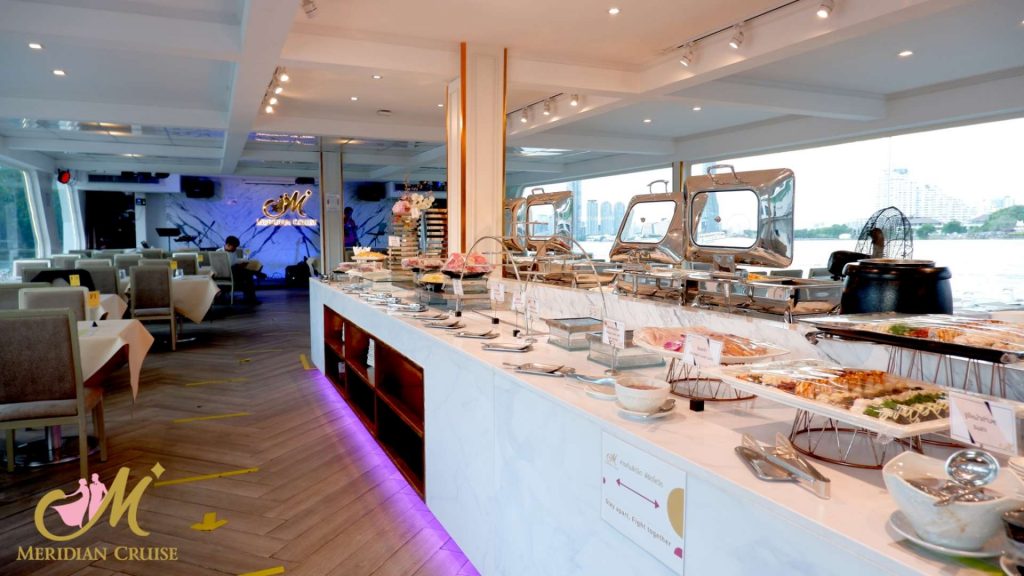ดื่มด่ำไปกับบรรยากาศของ เมอริเดียนครูซ ตระการตากับแสงสียามค่ำคืนในท้องน้ำเจ้าพระยา ละเมียดละไมกับอาหารนานาชาติ ที่ตั้งใจรังสรรค์ด้วยวัตถุดิบชั้นยอด หลากหลายเมนู ชมการแสดงศิลปวัฒนธรรมไทยอันน่าภาคภูมิใจและรับฟังบทเพลงไพเราะ อีกทั้งบริการคุณภาพระดับโรงแรมห้าดาว