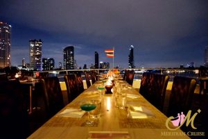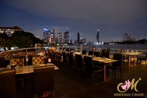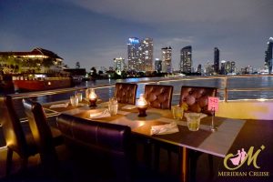 ดื่มด่ำไปกับบรรยากาศแห่งความหรูหรางดงามของ เมอริเดียนครูซ ตระการตากับแสงสียามค่ำคืนในท้องน้ำเจ้าพระยา ละเมียดละไมกับอาหารนานาชาติ ที่ตั้งใจรังสรรค์ด้วยวัตถุดิบชั้นยอด หลากหลายเมนู ชมการแสดงศิลปวัฒนธรรมไทยอันน่าภาคภูมิใจและรับฟังบทเพลงไพเราะ อีกทั้งบริการคุณภาพระดับโรงแรมห้าดาวให้ค่ำคืนที่แสนโรแมนติกของคุณเต็มเปี่ยมไปด้วยความสุขกับคนพิเศษข้างกาย