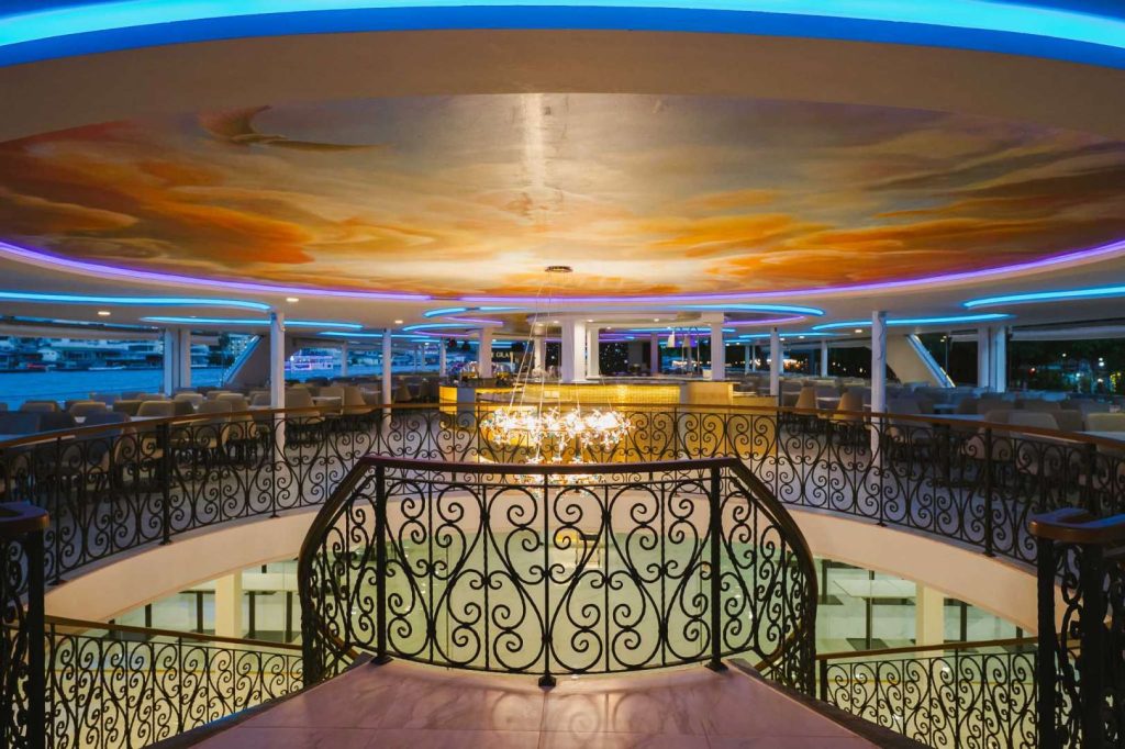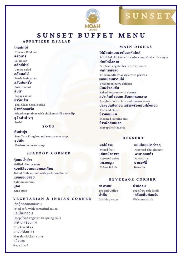 ดื่มด่ำกับทัศนียภาพอันงดงามของแม่น้ำเจ้าพระยา พร้อมลิ้มรสอาหารบุฟเฟต์สุดพรีเมียมกว่า 30 เมนู ทั้งอาหารไทย อาหารนานาชาติ ซูชิและซาชิมิ อาหารทะเลสดใหม่ อาหารมังสวิรัติ ขนมหวานไทย เค้ก และผลไม้ตามฤดูกาล แถมดื่มไม่อั้นกับน้ำอัดลม ตลอดการเดินทาง เพลิดเพลินไปกับเสียงดนตรีไพเราะ ทั้งเพลงไทยและเพลงสากล ขับกล่อมโดยนักร้องมากฝีมือ