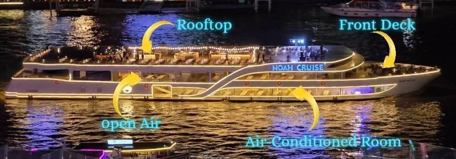 เรือโนอาห์ ครูซ (Noah Cruise) เป็นเรือสำราญสุดหรู ขนาดกว้าง 15 เมตร ยาว 65 เมตร สูง 3 ชั้น รองรับผู้โดยสารได้สูงสุดถึง 1,180 ท่าน โดยมีรายละเอียดแต่ละชั้นดังนี้: