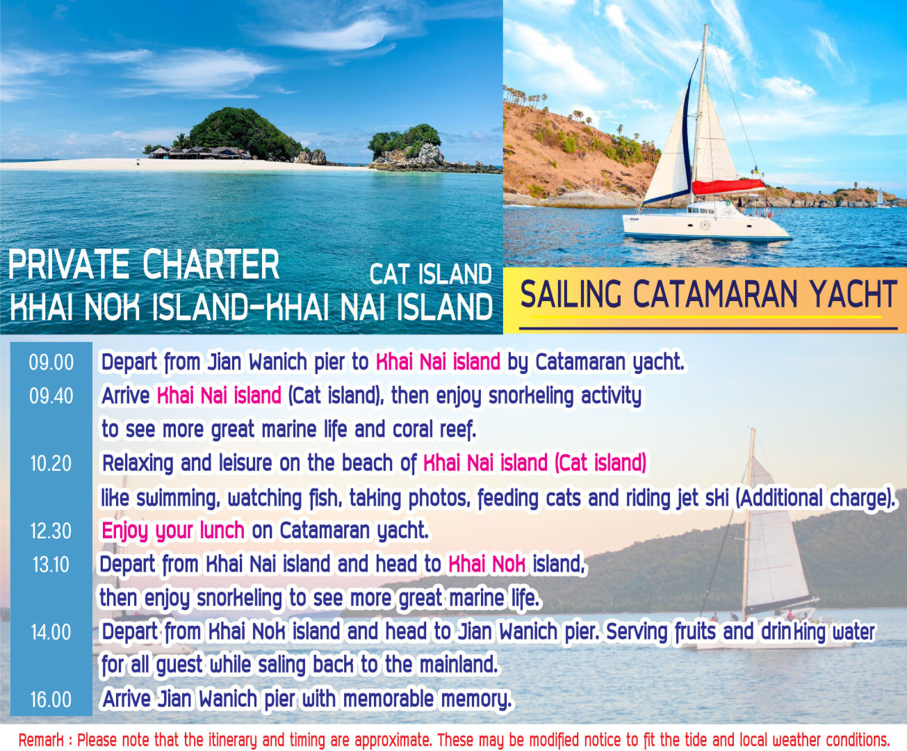 เรือยอร์ชคาตามารันมีหลายลำ หลายขนาด ลูกค้าจะทราบว่าได้เรือลำไหน 1 วันก่อนเดินทาง เนื่องจากแผนกจัดเรือและผู้บริหารจะเป็นฝ่ายจัดสรรเรือให้ตามความเหมาะสมของลูกค้าในแต่ละโปรแกรม