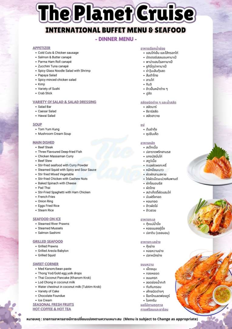 ตระการตาไปกับการตกแต่งในธีมอวกาศสุดหรูหราของ เรือเดอะ แพลนเน็ต ครูซ ดื่มด่ำกับบรรยากาศยามค่ำคืนในท้องน้ำเจ้าพระยา ละเมียดละไมกับอาหารนานาชาติ ที่ตั้งใจรังสรรค์ด้วยวัตถุดิบชั้นยอด หลากหลายเมนู และรับฟังบทเพลงไพเราะ อีกทั้งบริการคุณภาพระดับโรงแรมห้าดาวให้ค่ำคืนที่แสนโรแมนติกของคุณ เต็มเปี่ยมไปด้วยความสุขกับคนพิเศษข้างกาย