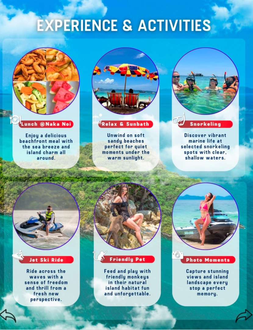 ออกเดินทางจาก AA Marina เตรียมตัวขับเจ็ทสกีไปผจญภัยกับเกาะสุดน่าตื่นเต้นจุดที่ 1 : เกาะมะลิ เป็นเกาะที่ยังคงความบริสุทธิ์ของธรรมชาติ เหมาะสำหรับการแวะถ่ายรูปจุดที่ 2: เกาะแพ มีทะเลแหวกเป็นไฮไลท์ เดินบนทรายนุ่มๆจุดที่ 3: อ่าวปอ แกรนด์ มารีน่า ชมท่าเรือยอร์ชสุดหรูของภูเก็ตจุดที่ 4 เกาะลิง เยี่ยมชมเหล่าลิงและถ่ายรูปจุดที่ 5 เกาะนาคาใหญ่ ดำน้ำตื้นชมแนวปะการังและปลาหลากสีในน้ำใสจุดที่ 6 เกาะนาคาน้อย-พักทานอาหารกลางวัน พักผ่อนบนเกาะส่วนตัวอันเงียบสงบ อิ่มอร่อยกับมื้อกลางวันและผ่อนคลายบนชายหาดจุดที่ 7 เกาะรังน้อย เป็นเกาะเล็กๆ เงียบสงบ ไม่วุ่นวาย น้ำทะเลใสมากๆ เหมาะแก่การพักผ่อนจุดที่ 8 เกาะรังใหญ่ เกาะแห่งกิจกรรม! เพลิดเพลินกับการว่ายน้ำหรือผ่อนคลายกับบรรยากาศสุดชิลจุดที่ 9 ป่าชายเลน ผ่านป่าชายเลนอันเงียบสงบ สัมผัสธรรมชาติอันเงียบสงบก่อนเดินทางกลับกลับสู่ AA Marina พร้อมความทรงจำอันแสนวิเศษ |