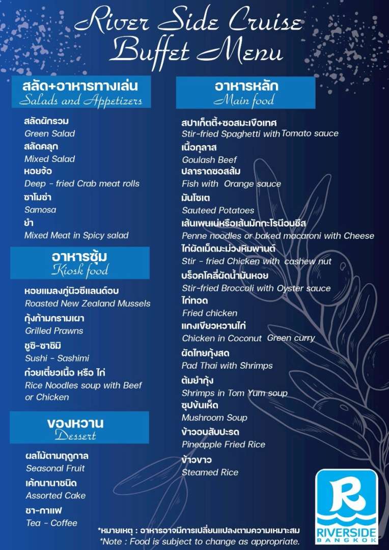 เรือริเวอร์ไซด์ ออกจากท่าเรือ ล่องตามลำน้ำเจ้าพระยา วกกลับที่เอเชียทีค พร้อมบริการอาหารค่ำบนเรือแบบบุฟเฟ่ต์ไทย-นานาชาติ-ซีฟู้ด และมี DJ เปิดแผ่น และสนุกสนานไปกับการแสดงโชว์ carnival สุดอลังการ และรับฟังดนตรีสด ที่มีให้ฟังบนเรือตลอดการเดินทาง |