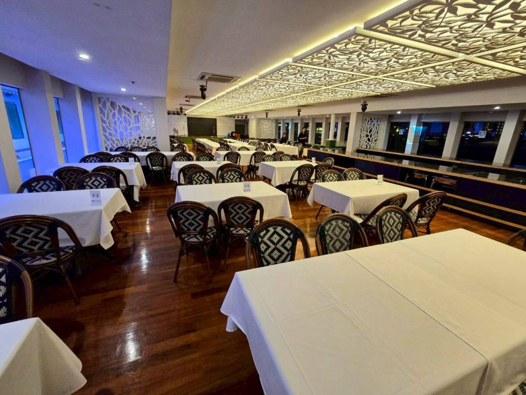 Riverside Cruise is a large two-deck luxury cruise ship and the only cruise on the Chao Phraya River that offers authentic halal cuisine, complete with a prayer room onboard.