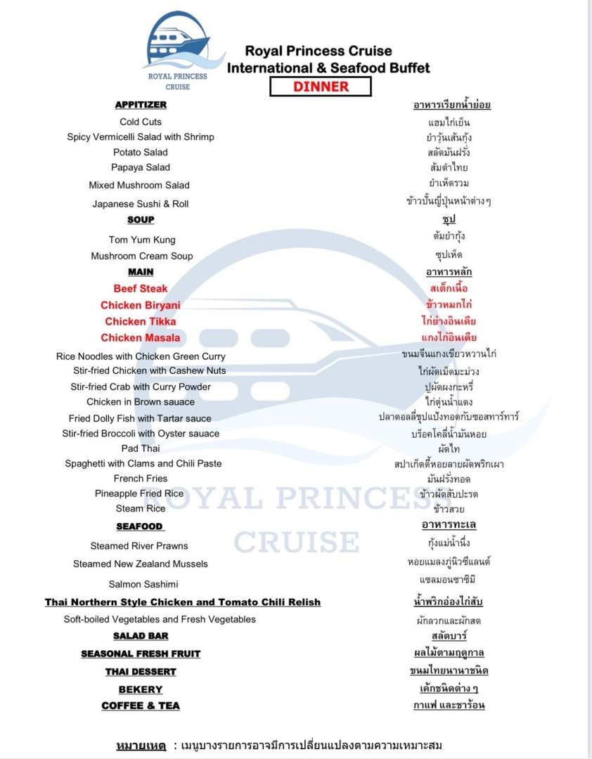 ดื่มด่ำไปกับบรรยากาศแห่งความหรูหรางดงามของ รอยัลปริ๊นเซส ครูซ ตระการตากับแสงสียามค่ำคืนในท้องน้ำเจ้าพระยา ละเมียดละไมกับอาหารนานาชาติ ที่ตั้งใจรังสรรค์ด้วยวัตถุดิบชั้นยอด หลากหลายเมนู และรับฟังบทเพลงไพเราะ อีกทั้งบริการคุณภาพระดับโรงแรมห้าดาวให้ค่ำคืนที่แสนโรแมนติกของคุณ เต็มเปี่ยมไปด้วยความสุขกับคนพิเศษข้างกาย