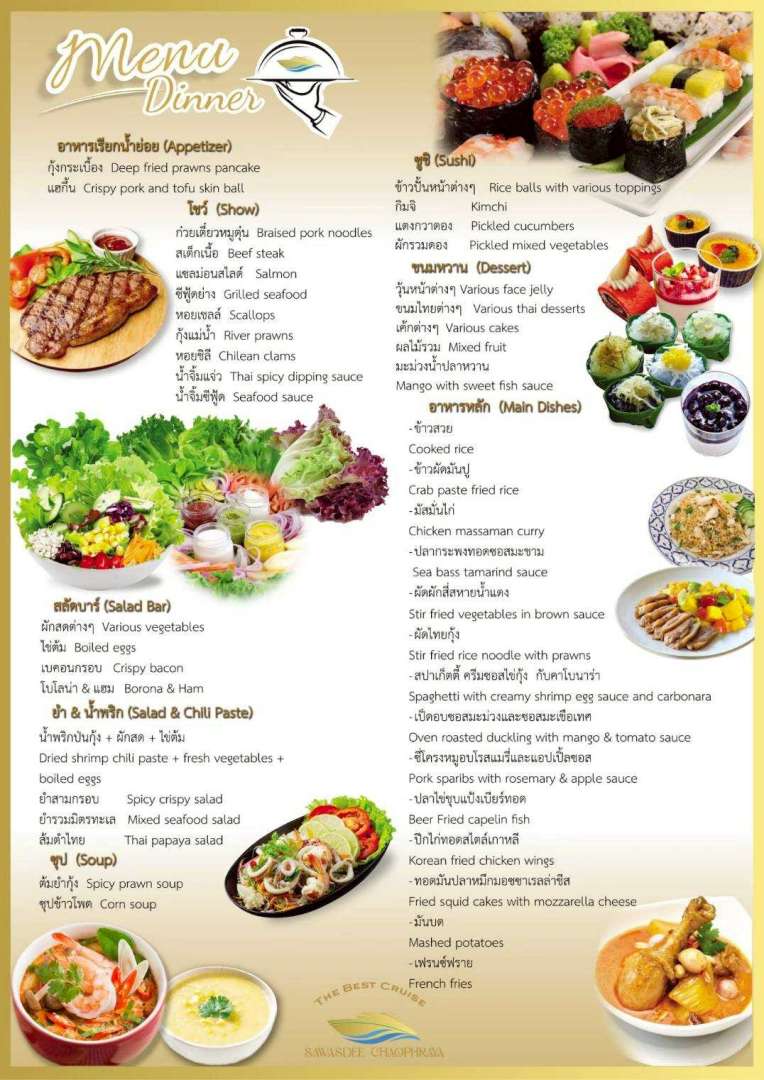 เชิญสัมผัสประสบการณ์การล่องเรือสำราญสวัสดีเจ้าพระยา ดื่มด่ำกับบรรยากาศสองฝั่งของแม่น้ำเจ้าพระยาอันแสนโรแมนติก ชมวิวแม่น้ำเจ้าพระยา 360 องศา ผ่านชมสถานที่สำคัญมากมาย อาทิ เช่น วัดกัลยาณมิตร ป้อมวิชัยประสิทธิ์ วัดอรุณราชวราราม พระบรมมหาราชวัง สะพานพระรามแปด เป็นต้น อิ่มอร่อยอาหารค่ำแบบบุฟเฟ่ห์ไทย-นานาชาติ หลากหลายเมนู, ซีฟู๊ด กุ้งแม่น้ำ หอยชิลี หอยเชลล์ ปลาแซลมอน พร้อมเพลิดเพลินไปกับการแสดงรำไทย การแสดงโขน ดนตรี และนักร้องคอยขับกล่อมท่าน ที่จะทำให้เป็นคืนพิเศษของคุณ และคนที่คุณรักซาบซึ้งใจมิรู้ลืม