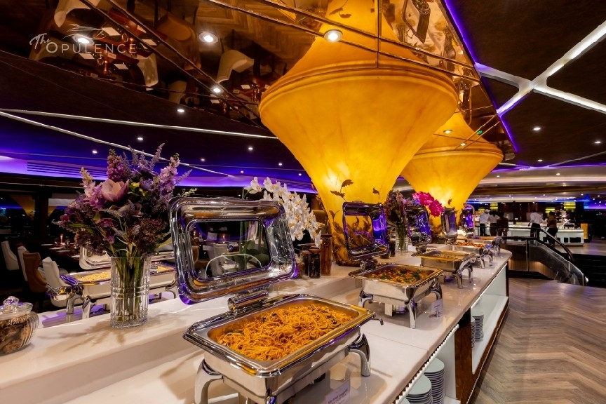 Welcome everyone to the newest and largest 3-story Chao Phraya River Cruise, The Opulence, a luxurious cruise ship built and decorated in a luxury interior, complete with brand new furniture and an underwater lighting system. Let you have a fresher experience than anyone else with delicious food, Thai-International food, and seafood, such as seafood stir-fried with curry powder, stir-fried snow peas with shrimps, river prawns and mussels on ice, grilled river prawns, sashimi, stir-fried spaghetti with chili paste, creamy potato soup, beef steak, beef stew, fried fish with lemon sauce, lasagna, fried chicken with Nambang sauce, stir-fried beef with kimchi, ice cream, and many more, totaling more than 30 menus.