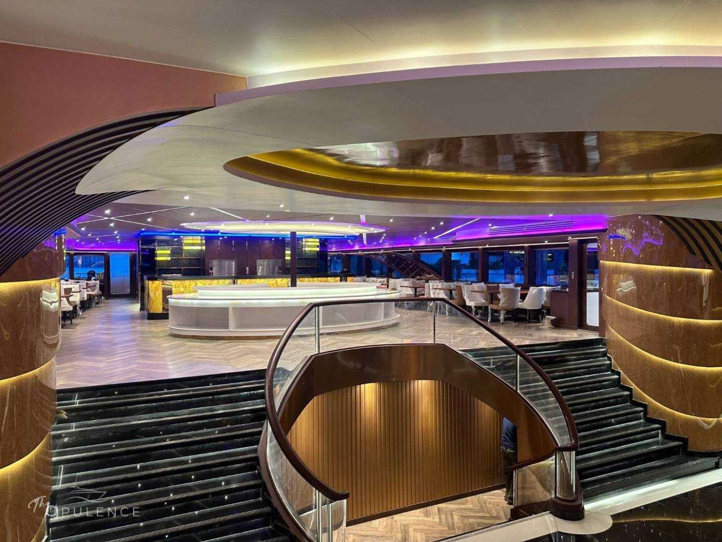 Opulence means wealth, riches, and luxury. This ship is ready to serve you all with splendor and can accommodate up to 850 passengers. It consists of a first-floor air-conditioned room that can accommodate up to 180 passengers. There is a VIP room that can accommodate 1–18 seats. Inside the VIP room, there is a microphone, sound system, and screen. You can sing karaoke, and employees are waiting to provide service with a bar in front of the room.