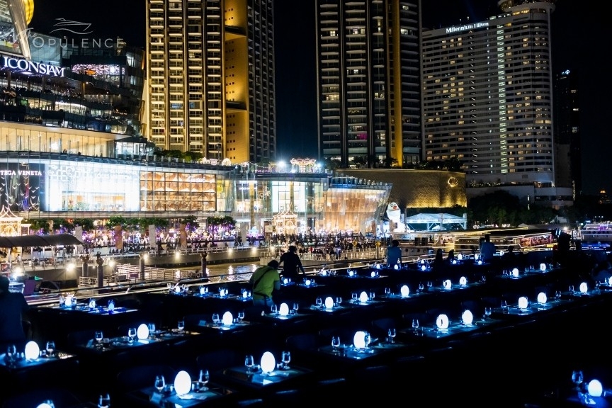 เรือดิ ออพพิวเลนซ์ ออกเดินทางจากท่าเรือที่ 2 ไอคอนสยาม มุ่งสู่สะพานพระราม 8 พาท่านล่องชมความสวยงามของสองฝั่งลำน้ำเจ้าพระในยามค่ำคืนรับประทานอาหารบุฟเฟต์นานาชาติเลิศรส เคล้าคลอด้วยดนตรีสดโดยนักร้องมืออาชีพ ตื่นตาตื่นใจกับความสวยงามของสถาปัตยกรรมสองฝั่งแม่น้ำเจ้าพระยา อาทิเช่น วัดกัลยาณมิตร, วัดอรุณราชวราราม, วัดพระแก้ว, เอเชียทีค และสถานที่สวยงามต่างๆ อีกมากมาย |