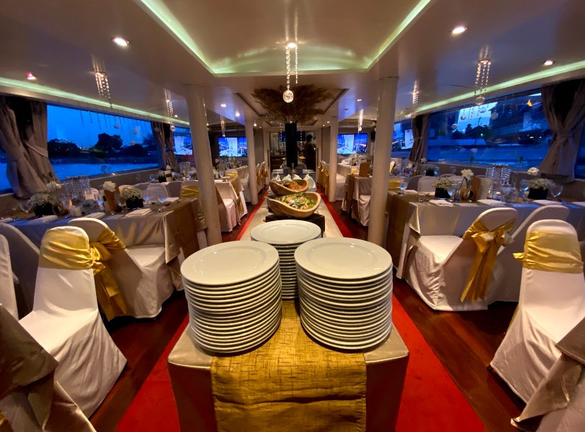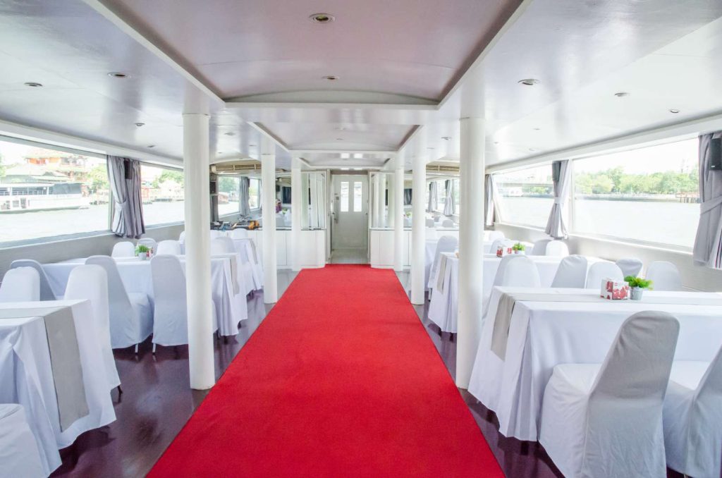 The Thong Chao Phraya is a medium-sized luxury cruise designed to accommodate large groups. This cruise features a spacious, air-conditioned cabin with a simple yet elegant design, offering a bright and comfortable ambiance.