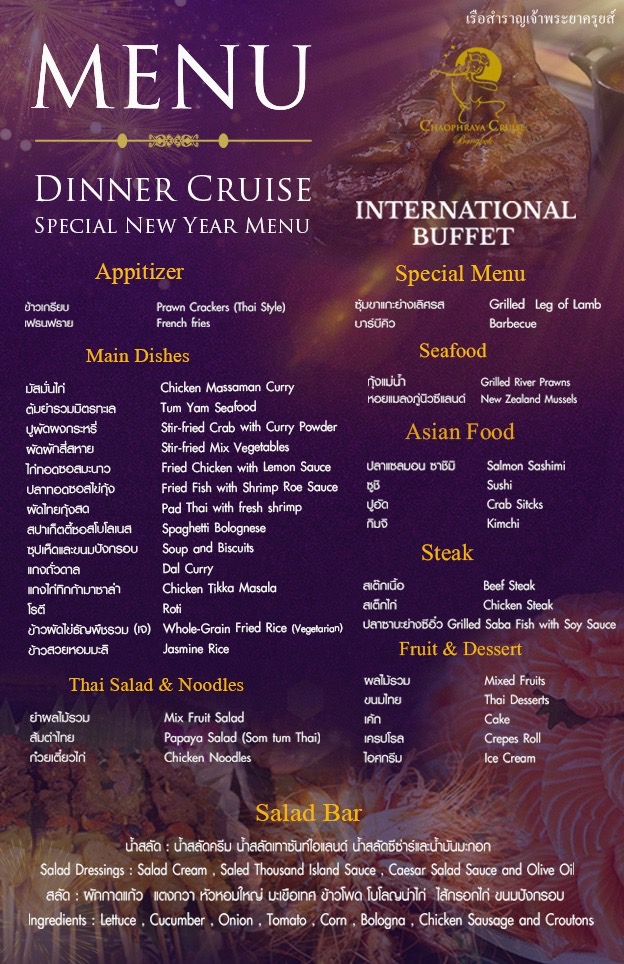 อัตรานี้รวม 1. เครื่องดื่มต้อนรับ+น้ำดื่ม+กาแฟร้อน+ชาร้อน 2. บุฟเฟต์ไทย-นานาชาติ+ซีฟู้ด 3. ดนตรีสด, รำไทย 4. มินิเค้กวันเกิด (สำหรับลูกค้าใช้บริการในเดือนเกิด) 5. กระทง 2 ท่าน / 1 ใบ(สำหรับการจองชั้นดาดฟ้า & หัวเรือชั้น 2) 6.เลือกเครื่องดื่มเบียร์ หรือ Whisky หรือ Red Wine ได้ท่านละ 1 แก้ว หรือเลือกน้ำอัดลมไม่อั้น 7. ภาษีมูลค่าเพิ่ม 7%