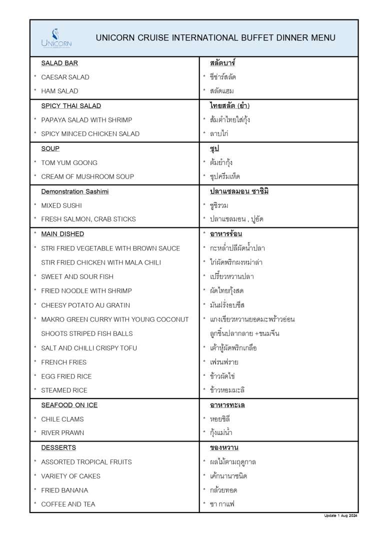 เชิญท่านมาสัมผัสประสบการณ์สุดพิเศษกับการล่องเรือสำราญลำใหม่สุดหรู เรือยูนิคอร์น ครูซ ในบรรยากาศยามค่ำคืนบนลำน้ำเจ้าพระยา ที่แสนงดงามประดุจเมืองฟ้าอมร เป็นการพักผ่อนในค่ำคืนอันน่าจดจำตลอด 2 ชั่วโมง ดื่มด่ำกับบรรยากาศอันแสนพิเศษ พร้อมทั้งอิ่มอร่อยกับอาหารบุฟเฟต์นานาชาติ และอาหารทะเลแบบจัดเต็มไม่อั้น ที่จะทำให้คืนพิเศษของคุณและคนรู้ใจเป็นค่ำคืนที่น่าจดจำ