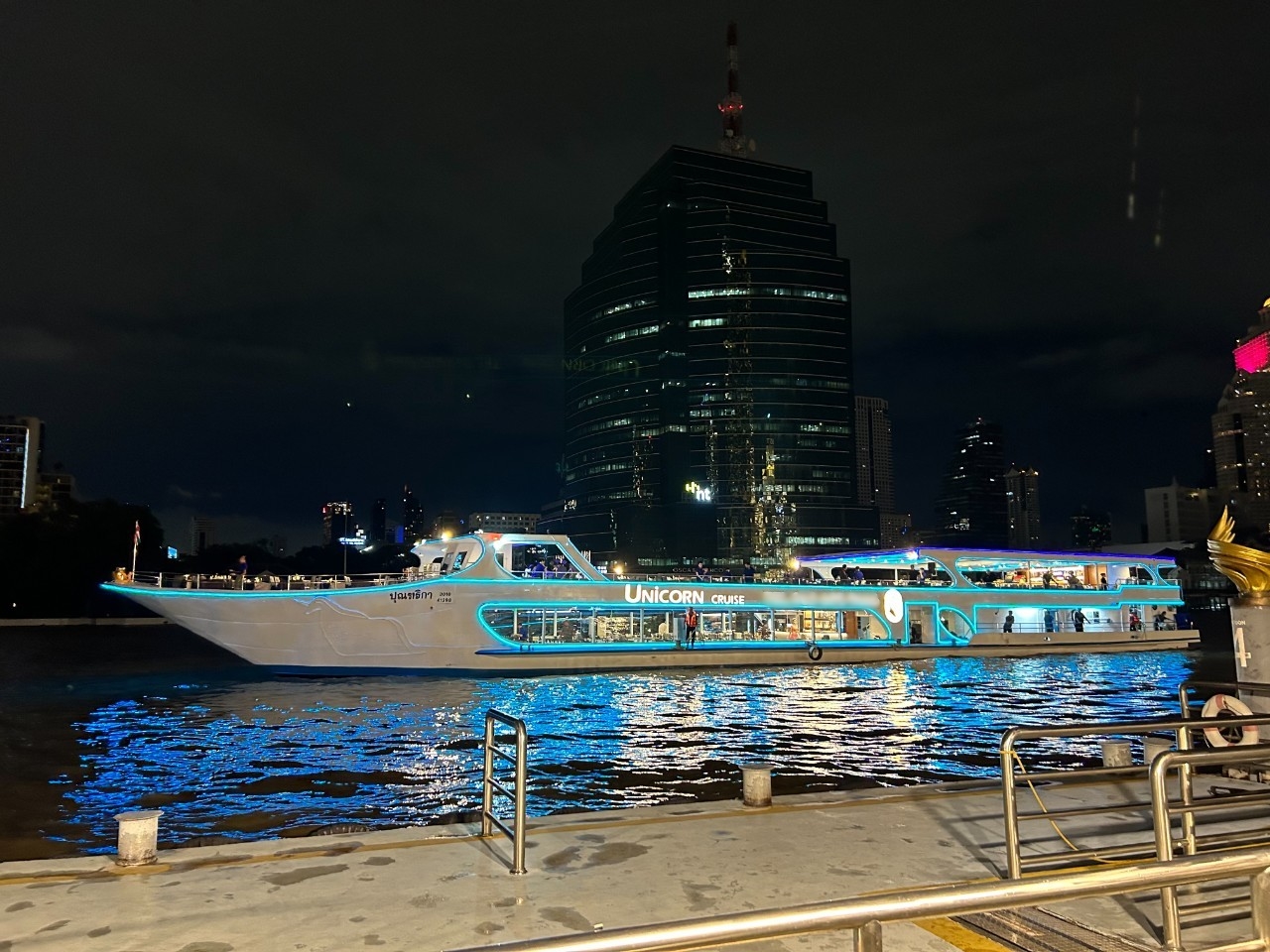 Unicorn Cruise is a 2-floor new cruise, the first floor is air-conditioned and the second floor is a rooftop open-air with a front deck. Let you get the wind to see the beautiful scenery of both sides of the Chao Phraya River at night.