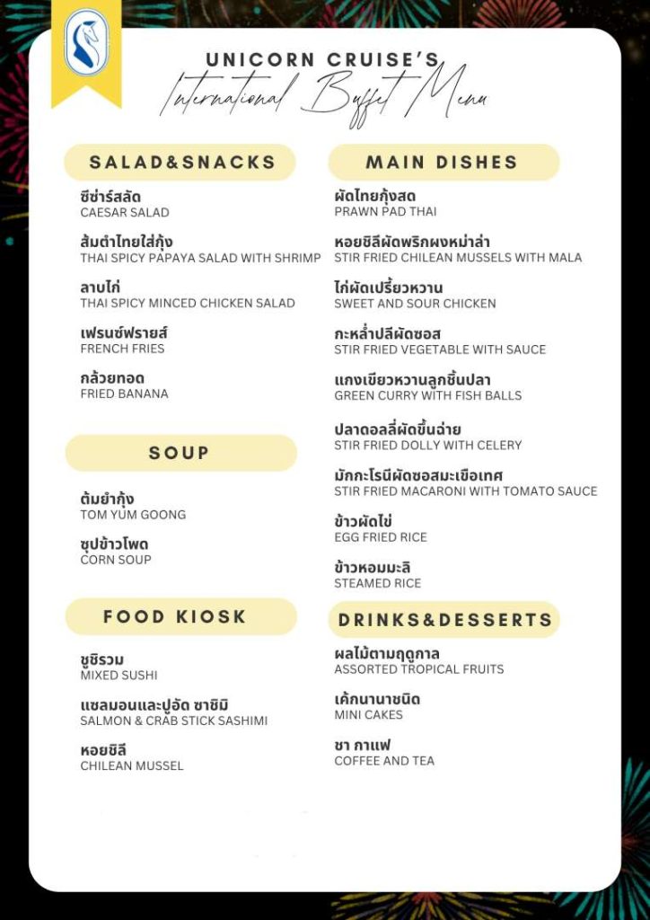 เชิญท่านมาสัมผัสประสบการณ์สุดพิเศษกับการล่องเรือสำราญลำใหม่สุดหรู เรือยูนิคอร์น ครูซ ในบรรยากาศยามพระอาทิตย์ตกบนลำน้ำเจ้าพระยา ที่แสนงดงามประดุจเมืองฟ้าอมร ดื่มด่ำกับบรรยากาศอันแสนพิเศษ พร้อมทั้งอิ่มอร่อยกับอาหารบุฟเฟต์นานาชาติ และอาหารทะเลแบบจัดเต็มไม่อั้น ที่จะทำให้ช่วงเวลาพิเศษของคุณและคนรู้ใจเป็นช่วงเวลาที่น่าจดจำ