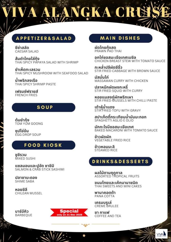 ดื่มด่ำไปกับบรรยากาศแห่งความหรูหรางดงามของ วีว่า อลังกา ครูซ ตระการตากับแสงสียามค่ำคืนในท้องน้ำเจ้าพระยา ละเมียดละไมกับอาหารนานาชาติ ที่ตั้งใจรังสรรค์ด้วยวัตถุดิบชั้นยอด หลากหลายเมนู ชมการแสดงศิลปวัฒนธรรมไทยอันน่าภาคภูมิใจและรับฟังบทเพลงไพเราะ อีกทั้งบริการคุณภาพระดับโรงแรมห้าดาวให้ค่ำคืนที่แสนโรแมนติคของคุณ เต็มเปี่ยมไปด้วยความสุขกับคนพิเศษข้างกาย