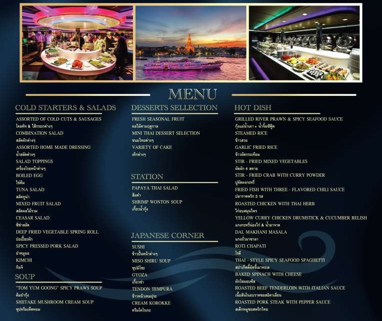 ล่องเรือรับประทานอาหารค่ำแบบบุฟเฟ่ต์นานาชาติ สนุกสนานเพลิดเพลินกับเสียงดนตรีและการแสดง สัมผัสทัศนียภาพของสถาปัตยกรรมอันงดงามริม 2 ฝั่งแม่น้ำเจ้าพระยา ได้แก่ วัดอรุณราชวราราม และพระบรมมหาราชวัง วัดพระแก้ว และสะพานพระรามแปด