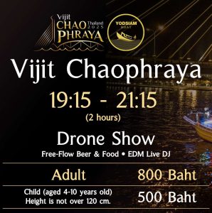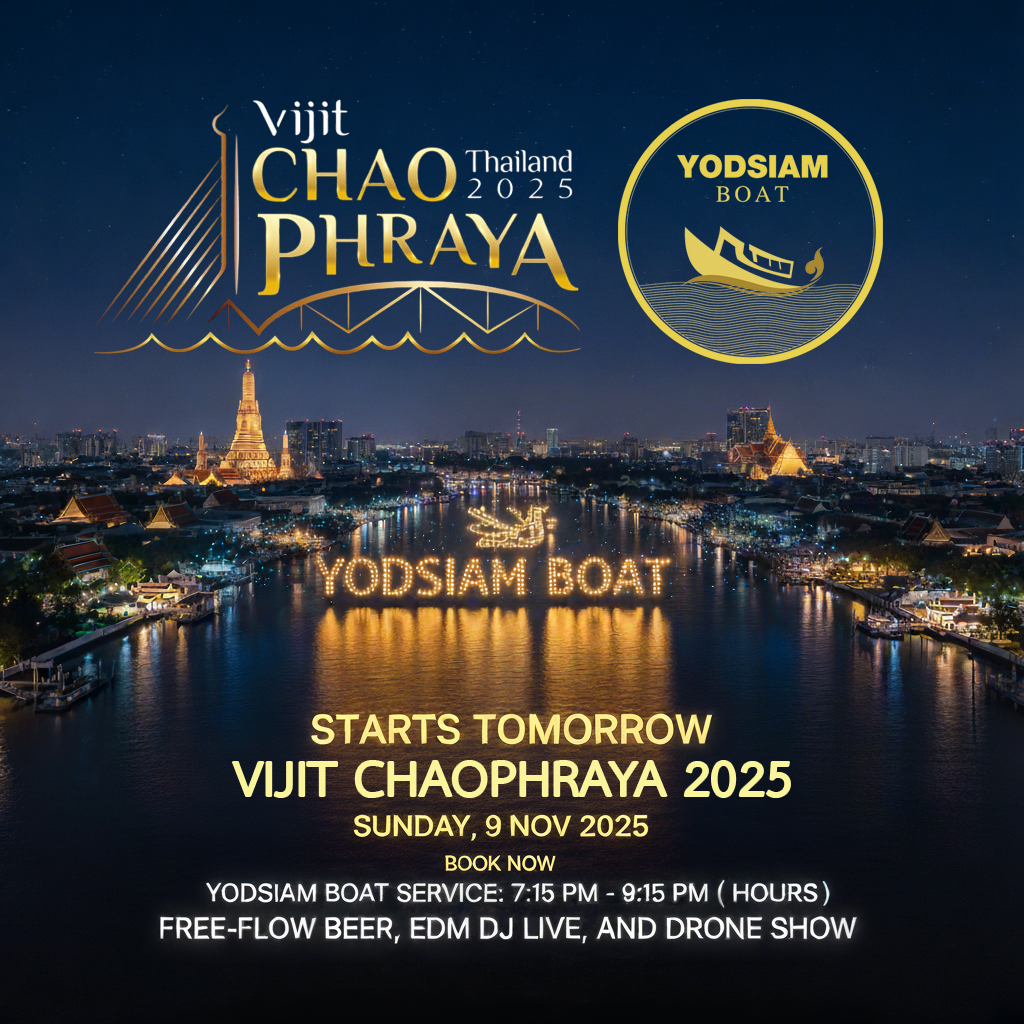 Boarding at Asiatique Pier, Pier 2Yod Siam Cruise is ready to welcome you to the “Wichit Chao Phraya 2025” event.Experience a magical evening on the beautiful Chao Phraya River as you cruise and take in the stunning panoramic night views along both sides of the river.Enjoy spectacular lights, electrifying EDM music, free-flow beer, and a fully loaded buffet throughout the 2-hour cruise!Don’t miss it!!! 🎆 Drone Show at 8:45 PM. |