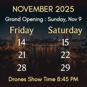 Don’t miss it!!! 🎆 Drone Show at 8:45 PM, according to the show schedule for November–December 2025.